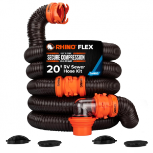 Camco RhinoFLEX 20-Ft RV Sewer Hose Kit – Features Clear Elbow Fitting w/Removable 4-in-1 Adapter – Connects to 3” Slip or 3”/3.5”/4” NPT Threaded Sewer Connection (39742)
