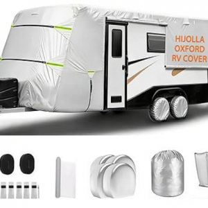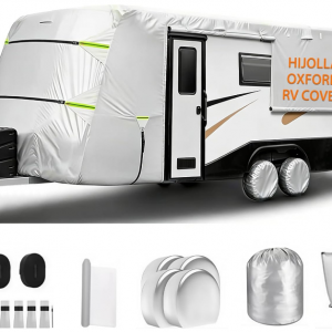 RV Cover,Oxford Fabric Travel Trailer Cover RV Cover 27′-30’Recreational Vehicle Anti-UV Waterproof Camper Cover Including 4 Tire Covers and Gutter Covers,Tongue Jack Cover and Storage Bag