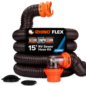 Camco RhinoFLEX 15-Ft RV Sewer Hose Kit – Features Clear Elbow Fitting w/Removable 4-in-1 Adapter – Connects to 3” Slip or 3”/3.5”/4” NPT Threaded Sewer Connection (39770)