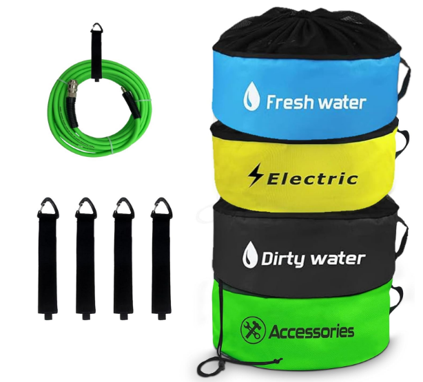 • 4 COLORS FOR CONVENIENT IDETIFICATION – There are 3 RV accessories bags in different colors with words: blue bag for storing fresh drinking water hoses, black bag for the dirty/black water hoses/sewer hoses, yellow bag for electrical cords/cable. and the green one for other accessories. Help you separate your camper hoses and cords, and you can quickly know which bag they are in and get the right one when you need to use them.