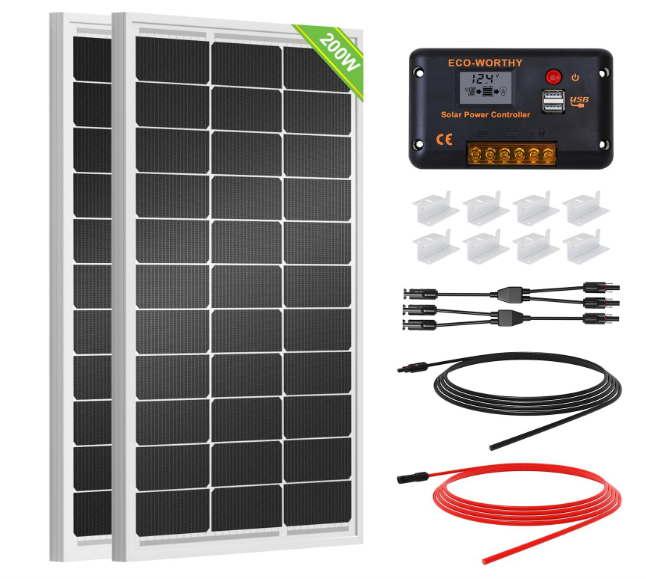 - [Complete and Easy]: The back of the pre-drilled and plug-and-play cables allow quick installation, the kit can be connected in series (24V) or parallel (12V) if you need. What you will get: 2 pcs 100W mono solar panel + 2 set of Z mounting brackets + 30A solar controller + 1 pair of 16.4ft 10 awg solar cables + 1 pair of 2-in-1 connectors + 1 pair of 4.92ft tray cable.