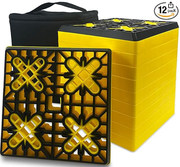 • Pack of 12: The ROBLOCK RV leveling block set includes 10 yellow leveling blocks and 2 RUBBER TOP. Stack the leveling blocks to the right height to meet your needs